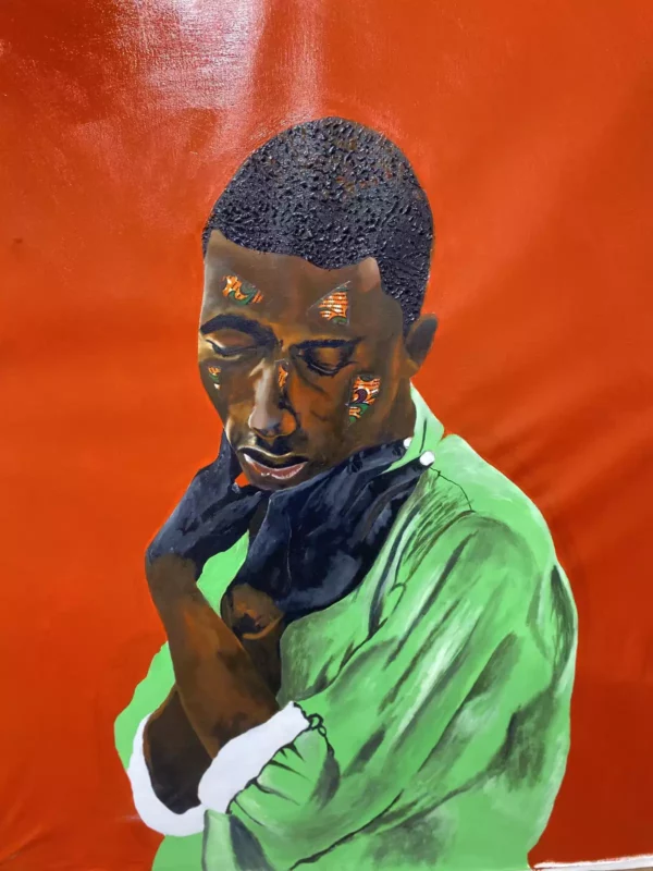 “Bulley” delves into the exploration of identity and the intertwining of culture and heritage. The artist’s masterful use of acrylic, textile, and oil adds depth and texture, creating a captivating expression on the man’s face, where wax textile adorns his features, reflecting the complexity of his persona.