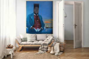 “New Negro” is a compelling and thought-provoking original oil on canvas painting by the talented Nigerian artist, Atiye Afolabi, currently showcased at the prestigious Artkofa online art gallery. This mesmerizing figurative artwork presents a striking portrait of a young black man, elegantly attired in the regal garments of a noble figure from the past. The scene unfolds during the sundown, setting the mood with warm and dusky hues that add depth and emotion to the composition.